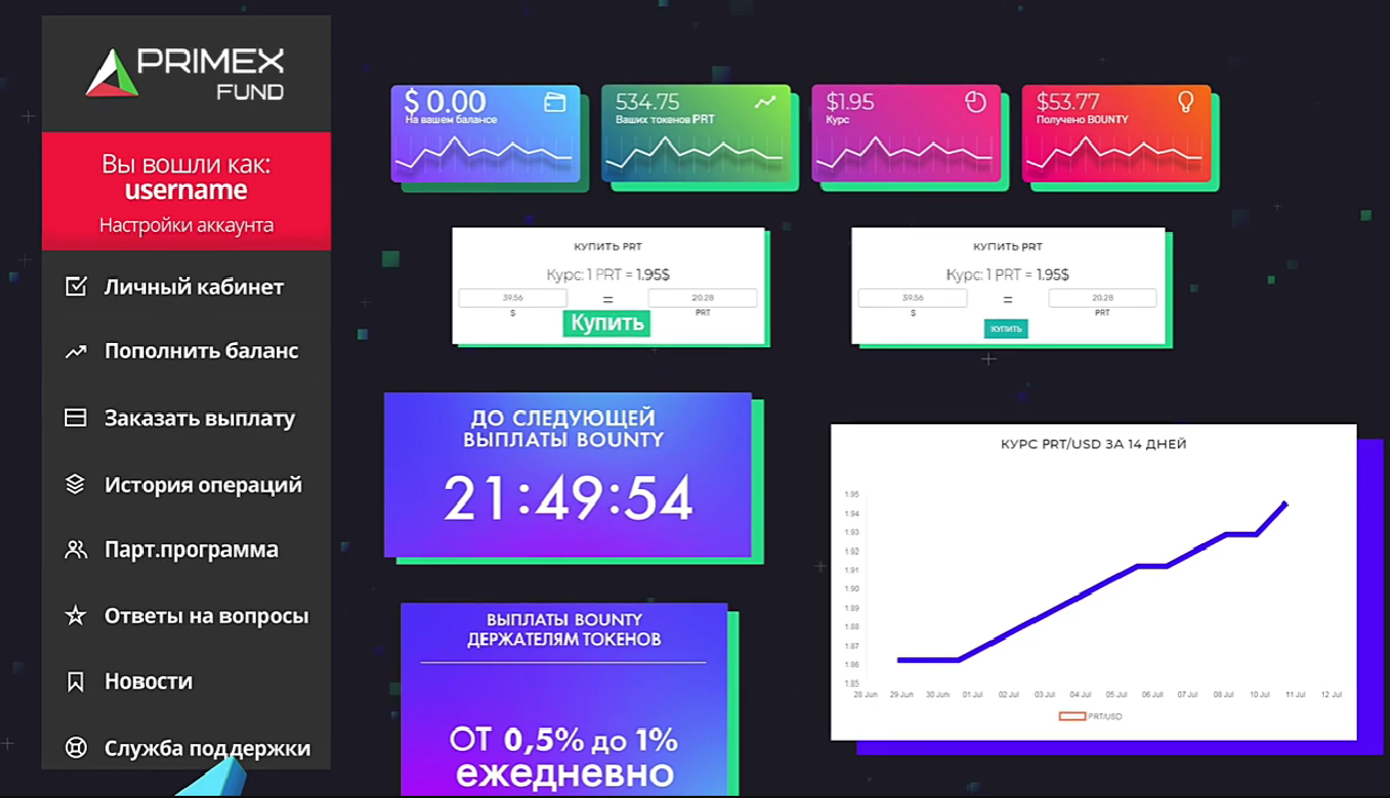 Платформа Primex Fund отзывы о своей работе пока не получила. Это инвестиционный проект, который предлагает зарабатывать на вложениях в криптовалюту. Пользователи могут покупать нативный токен проекта PRT и получать ежедневные отчисления, которые зависят от курса электронных активов. Создатели проекта заявляют, что прибыль компании обеспечивают профессиональные трейдеры и автоматизированные боты.