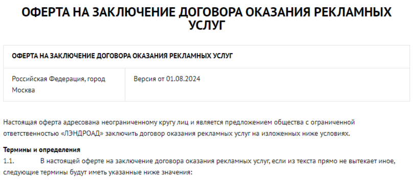 Юридической документации на площадке нет. Здесь удалось найти только документ «Оферта на заключение договора оказания рекламных услуг», который был заключен в августе 2024 года с фирмой «Лэндроад». Сам проект не имеет официального оформления, и это может нести риски для клиентов.