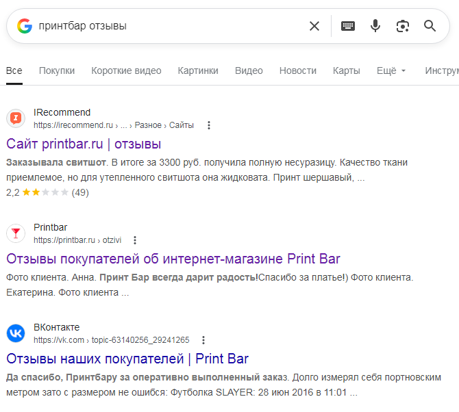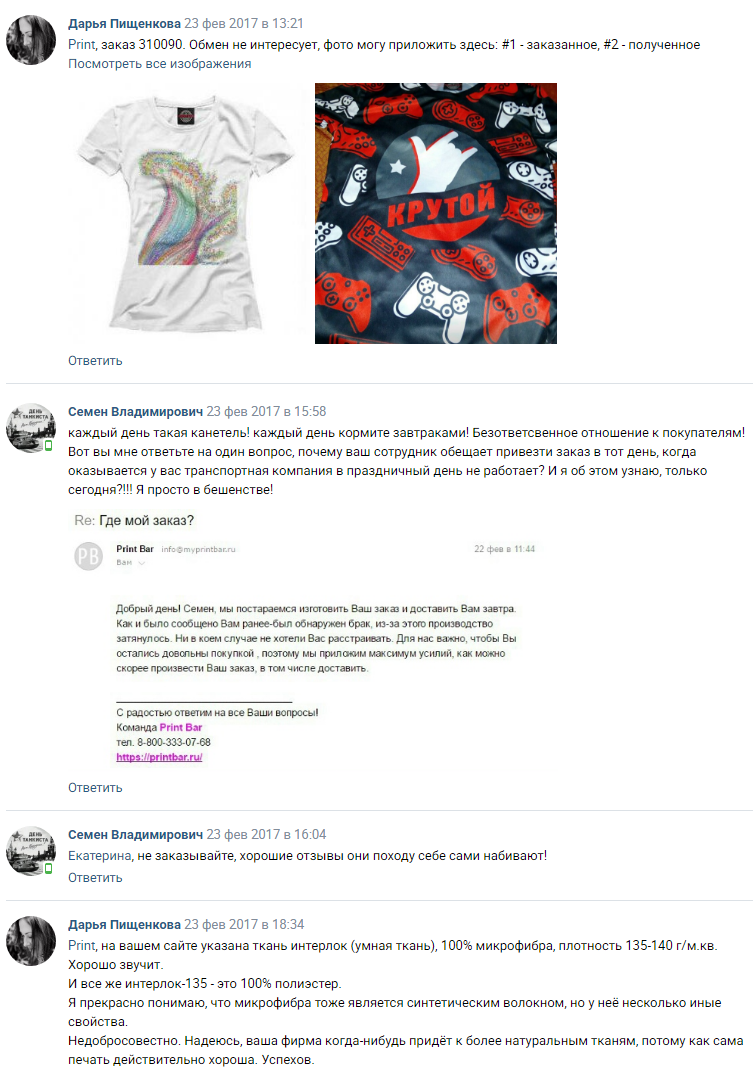 В интернете о проекте существенной информации не нашлось, что показывает его невостребованность. Отзывы в адрес интернет-магазина Printbar Ru на независимых платформах очень мало, и в основном, они не позитивные. Почти все высказывания расположены на площадках магазина. Подробнее о них мы расскажем позже.