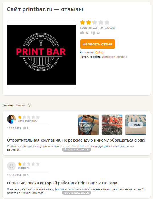 По словам руководства, проект работает с 2014 года, но их сайт был создан в 2010 году, а паблик в ВК – в 2015 году. В сети об интернет-магазине футболок «Принт Бар» информации очень мало, и первый отзыв в его адрес был оставлен в 2021 году. На этой платформе рейтинг магазина составляет 2,2/5 среди 49 проголосовавших.
