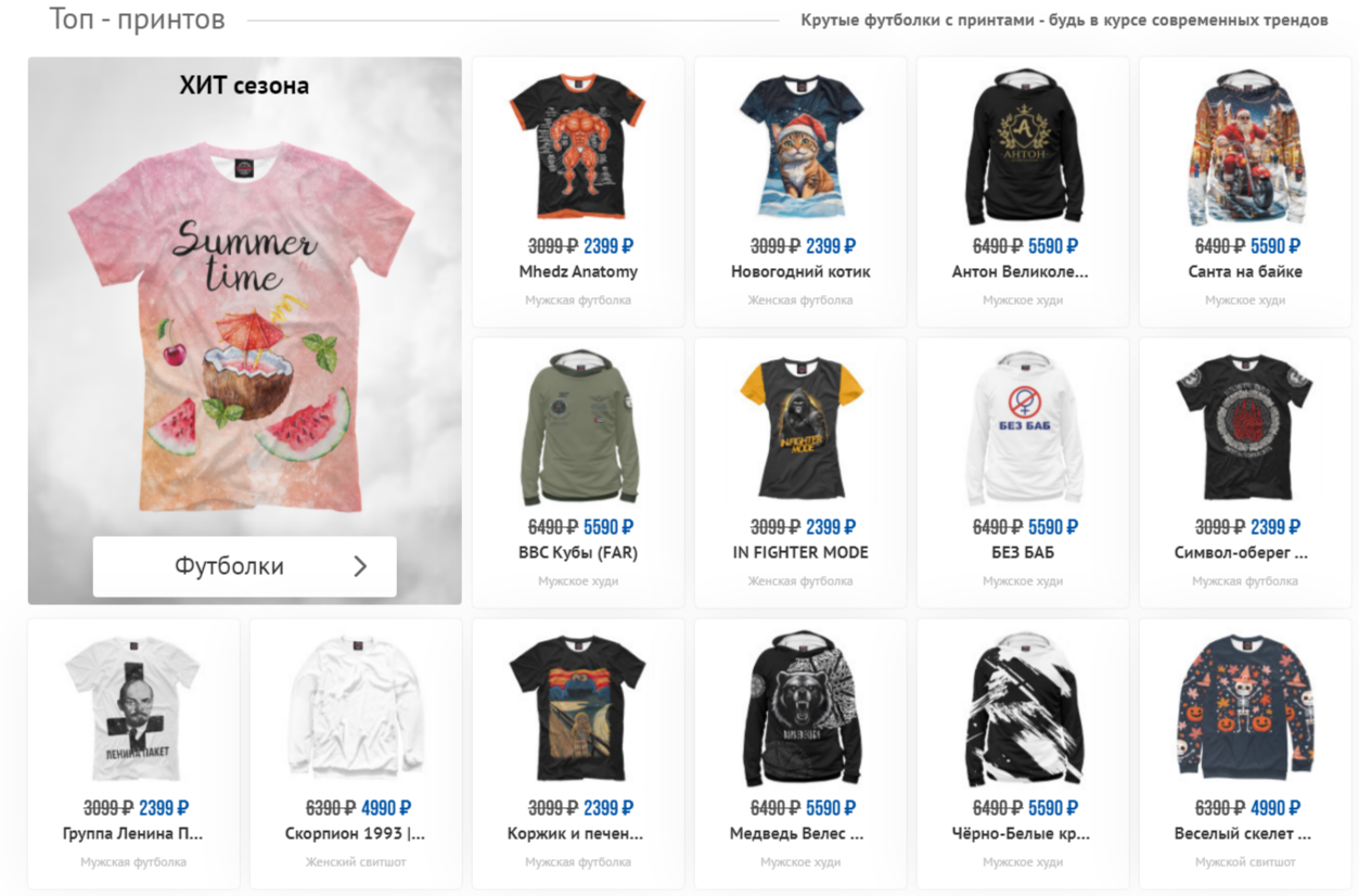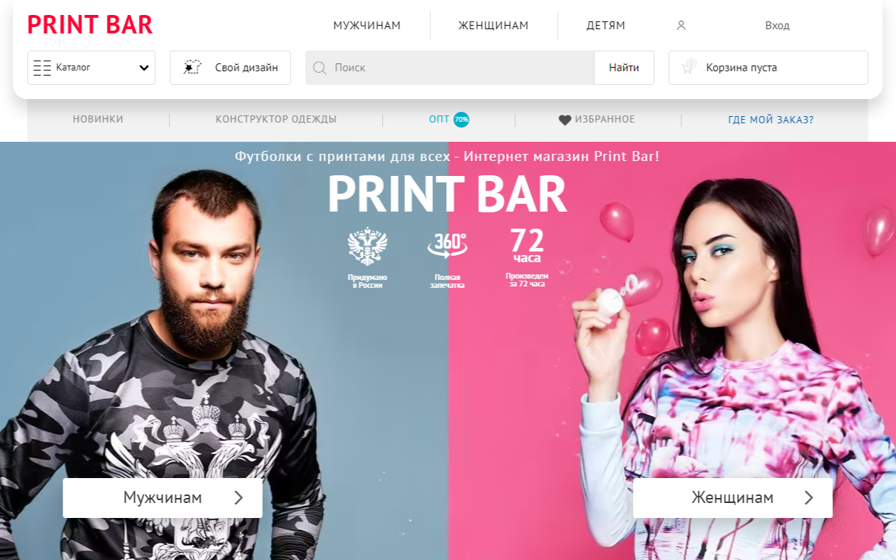 На главной странице интернет-магазина Printbar myprintbar ru пользователям сразу предоставляют каталог с товарами для мужчин и женщин. Авторы заявляют, что у них российское производство и качественная печать, которая занимает 3 дня.