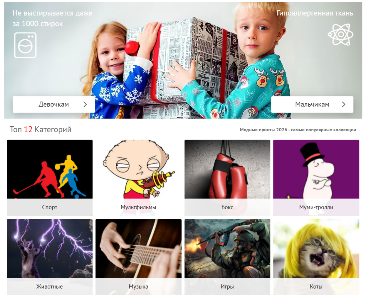 Проект «Принт Бар» позиционируется как интернет-магазин, печатающий желаемые изображения клиентов на футболках и другой качественной одежде, плюс, аксессуарах. На платформе представлен каталог примерных товаров для мужчин, женщин, мальчиков и девочек. Также есть каталог с готовыми товарами по категориями: спорт, мультфильмы, игры, коты и так далее.