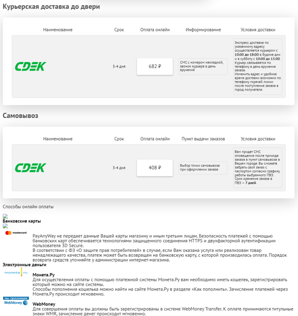 Магазин производит доставку продукции только через CDEK. Курьерская доставка до двери и самовывозом будет стоит по-разному, в зависимости от города назначения. Между ними разница около 300 рублей. В среднем самовывоз стоит 400 рублей. Оплата доступна разными способами: банковским картами и через электронный кошелек.