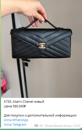 В еще одной записи канала демонстрируют клатч Chanel за 560 тыс. руб. Автор поста утверждает, что это оригинальное изделие известного бренда, однако мы не можем быть в этом уверены.