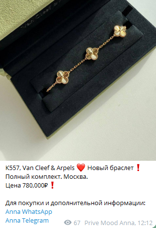 В одном из постов канала авторы предлагают приобрести золотой браслет за 780 тыс. руб. Его цена слишком высокая, чтобы покупатель мог безбоязненно оплатить такой товар через интернет и забрать его «не глядя».