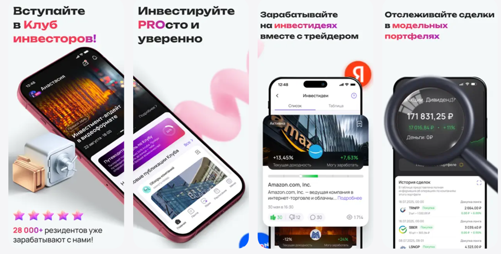 Сообщество «Про Клуб: Финансы И Инвестиции» доступно в личном кабинете и приложении. Пользователи могут посещать чат, телеграм-канал, а также ходить на личные встречи с участниками. Профессиональные трейдеры заключают сделки с большой доходностью. Результаты выкладываются на канал. Также пользователям доступны новости и обзоры. Вся информация предлагается на понятном языке, поэтому разобраться с нюансами работы смогут даже новички.