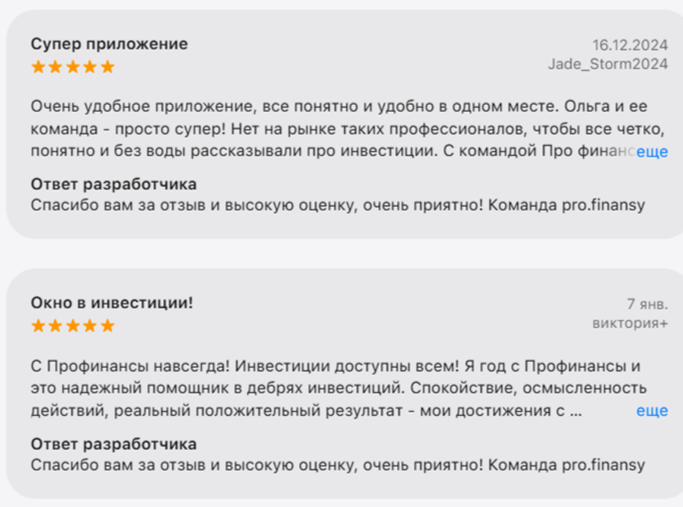 Отзывы о сообществе «Про Клуб: Финансы И Инвестиции» различные. На сайте есть положительные комментарии пользователей. Они хвалят приложение за удобство, а команду – за профессионализм и компетентность. Указано, что пользователи могут легко зарабатывать, если вступят в это сообщество.