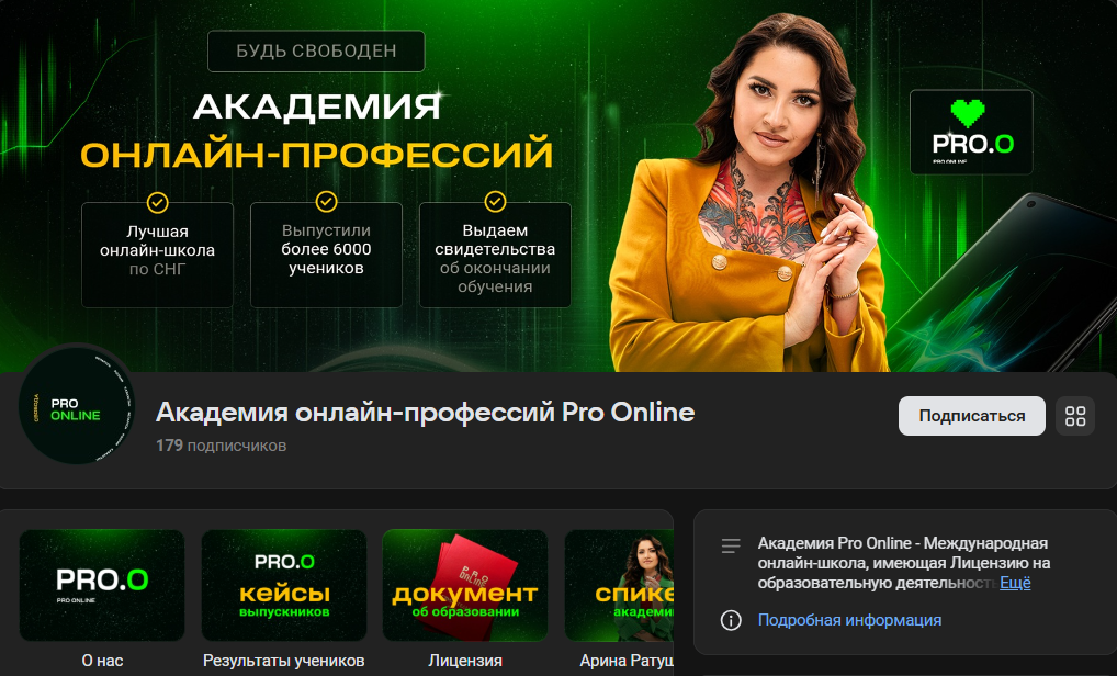 Pro Online Academy – это онлайн-школа, где предлагается обучаться профессиям современной цифровой эпохи с уклоном на использование ИИ, а также интернет-продажам и продвижению себя в Сети. Учредители проекта акцентируют внимание на официальной работе их учреждения и на направленности именно под обучение трендовым и прибыльным навыкам.