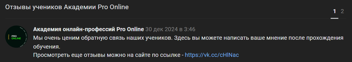В группе ВК авторы проекта создали форум, где просят всех студентов и выпускников писать свои отзывы на Pro Online Academy. Ссылка на комментарии также прикрепляется в основной группе проекта.