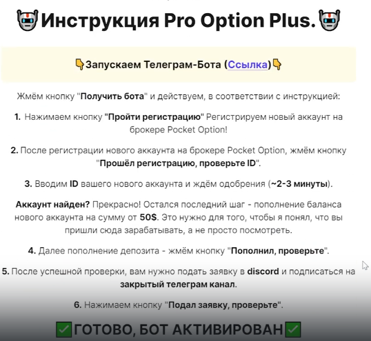 Чтобы начать работать с Pro Option Plus, необходимо перейти по ссылке в ТГ, запустить робота. Далее следует пройти регистрацию, сделать аккаунт на сайте по ссылке и проверить ID. На одобрение уходит 2-3 минуты, после чего можно внести первый депозит от 50 у.е. После проверки даются ссылки на закрытый ТГ канал и Дискорт. Бот активирован, можно начинать торговать.