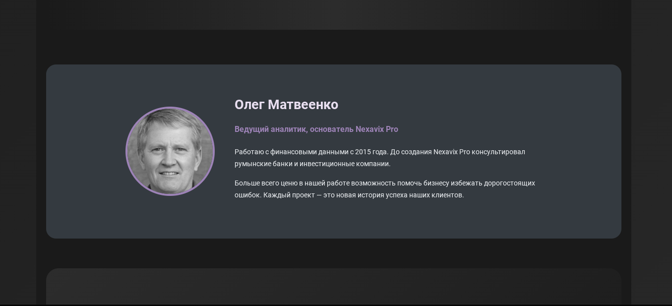 Биография на сайте крайне короткая и не имеет никаких подтверждений. Более того, неясно, действительно ли владельца аналитического сервиса зовут Олег Матвеенко. Больше похожа на то, что это очередной блеф от команды проекта. Также отметим следующие факты по проекту «Нексавикс Про»: