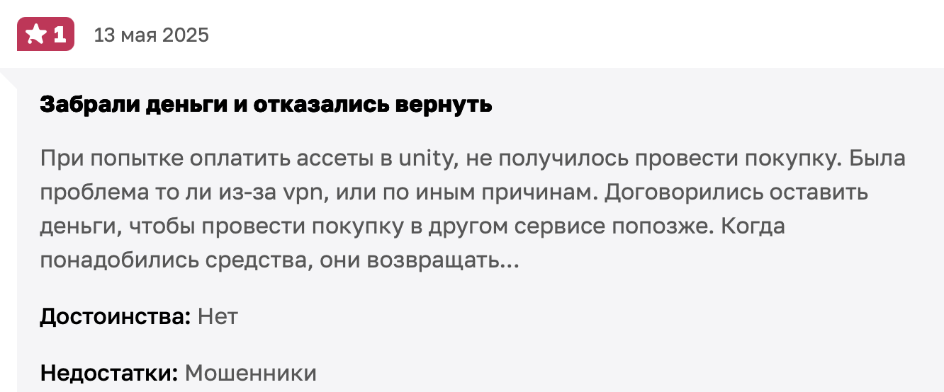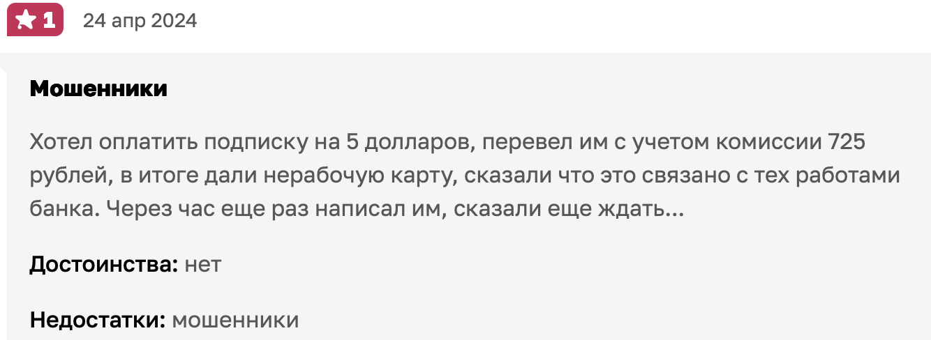Обман с комиссией — далеко не худший сценарий, ведь многие пользователи вовсе остались без денег и подписки. В отзывах платформу называют мошенниками, призывая читателей не связываться с аферистами и искать альтернативные способы покупки подписок. Вернуть средства, удержанные аферистами, почти невозможно: в правовом поле такой платформы просто не существует.