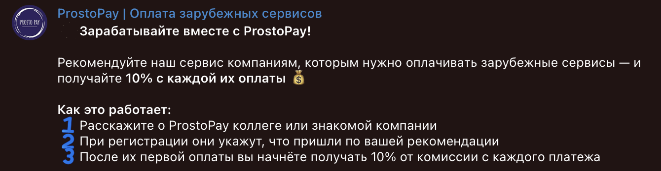 Кроме того, платформа приглашает клиентов участвовать в реферальной программе. В случае согласия пользователю присылают эксклюзивный код или ссылку, которую можно отправить друзьям и получать бонусы за совершаемые ими покупки. Сумма вознаграждения, озвученная сервисом Prosto Pay, составляет стандартные 10%.
