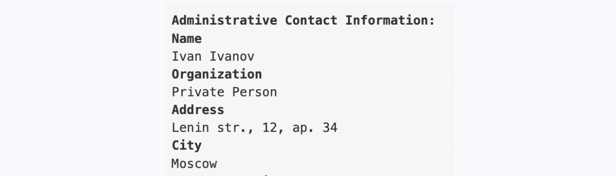 Добавим к этому занимательный нюанс: анализ доменного имени сайта показал, что он оформлен на «Ивана Иванова». Имя и фамилия явно взяты «с потолка», как и прочие регистрационные данные.