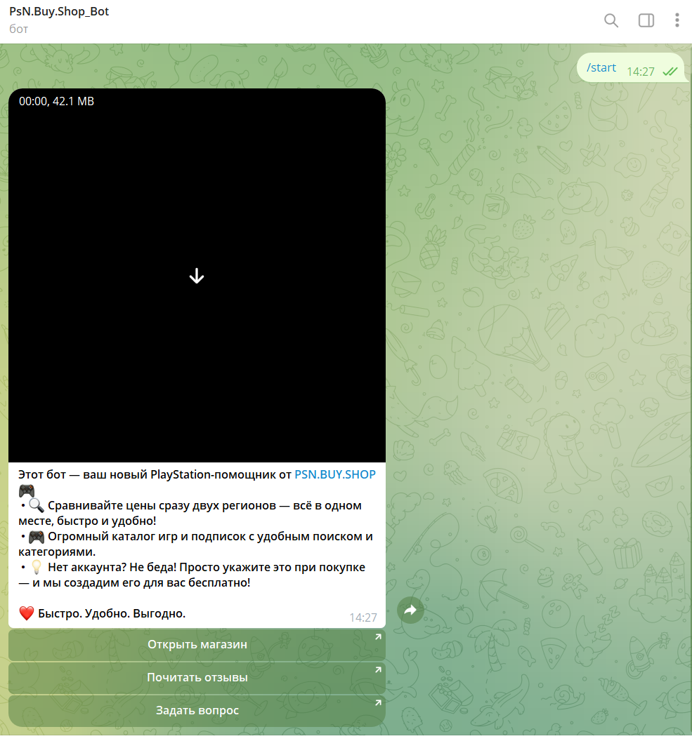 У онлайн-магазина также есть Psn buy shop bot, в котором можно не только посмотреть отзывы покупателей или задать вопрос. Владельцы позиционируют его как полноценный помощник для любителей Playstation.