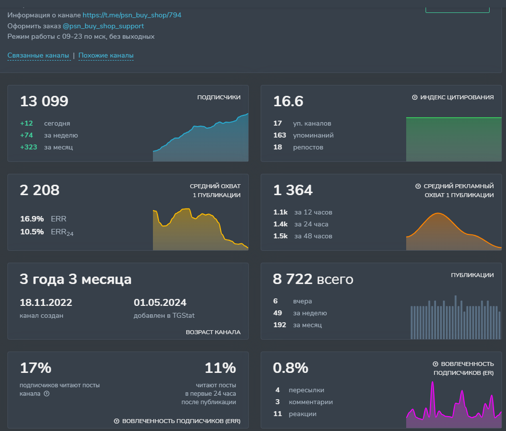 В основном информационном канале торгового пункта онлайн сейчас 13 тысяч участников. Средний охват публикации – 2 208 просмотров. Активная аудитория – только 17% от общего числа подписчиков. Остальные, «мертвые души» – просто купленные для увеличения численности фолловеров боты. Это, хотя и маленький, но обман.