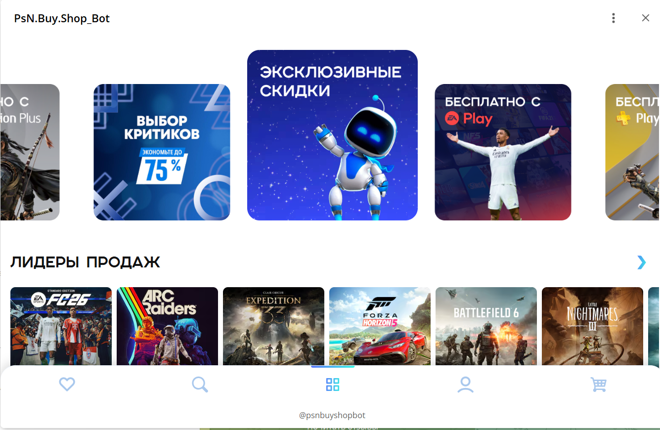 Также через бот доступно онлайн-приложение, в котором находится магазин Psn buy shop. Если в канале, чтобы получить выбранную игру, надо писать админу, то здесь возможна покупка товаров напрямую.