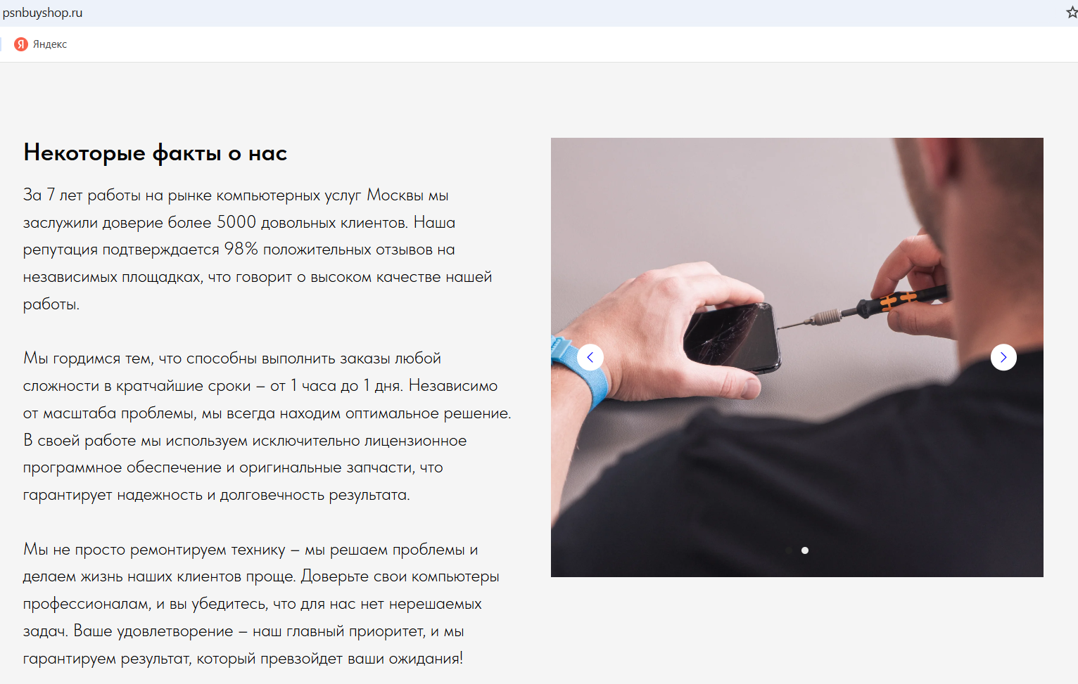 Создатели сайта немного рассказали о себе. На рынке компьютерных услуг Москвы они работают 7 лет и заслужили хорошую репутацию. Они успели обслужить более 5 тысяч клиентов, 98% которых оставили о Psn buy shop положительные отзывы. Проверить эти факты, к сожалению, нельзя.