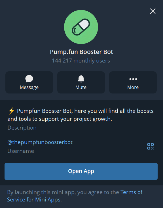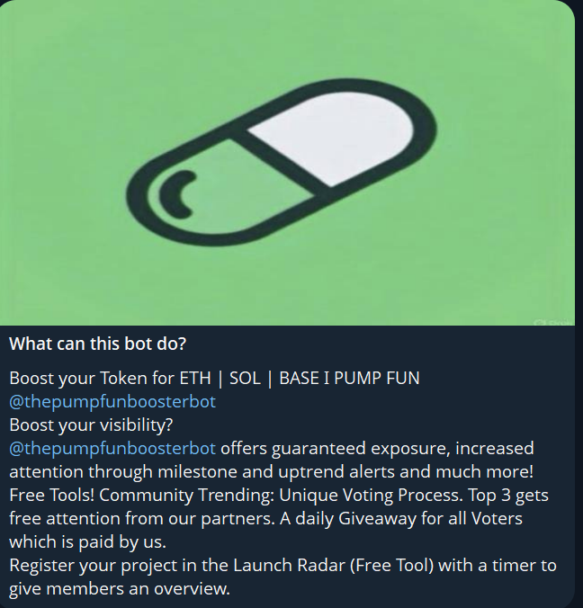 Pump Fun Booster Bot – это мини-приложение, которое создано для взаимодействия с токенами на блокчейне Solana и платформе Pump Fun. Тг-бот набирает около 144 000 пользователей в месяц. Инструмент создан для поддержки проектов в сфере мемкоинов и децентрализованных финансов. Однако вся деятельность сосредоточена в высокорисковой и слабо регулируемой области криптовалютных спекуляций.