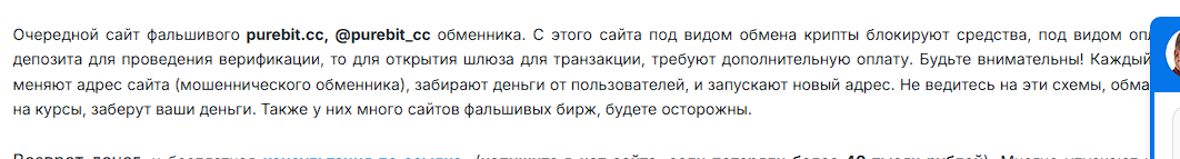 И наконец, настораживает полное отсутствие отзывов об обменнике purebit cc от реальных пользователей. Обычно даже новые сервисы быстро получают первые отклики – негативные и позитивные. Здесь же этого нет: всё, что можно обнаружить – попадание валютника в список лохотронов.