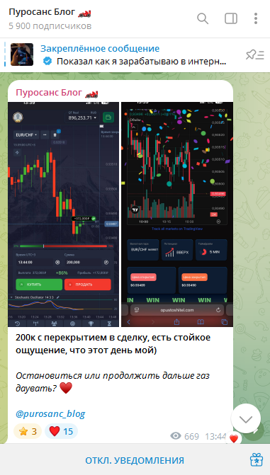 «Пуросанс блог» – ТГ канал трейдера Антона. Он якобы еще недавно работал на складе, получал маленькую зарплату и еле сводил концы с концами. Но затем он смог изменить свою жизнь к лучшему, благодаря валютному рынку. Он научился трейдингу и теперь хорошо зарабатывает сам, помогает другим, но известно это лишь со слов админа, доказательств этому нет.