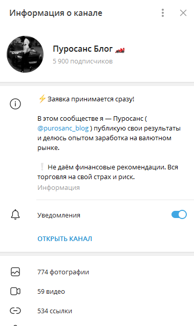 Канал в ТГ «Пуросанс блог» ведет трейдер, который рассказывает о трейдинге и делится торговыми сигналами. Мы проверили его на честность, изучили контент, отзывы и пришли к выводам: