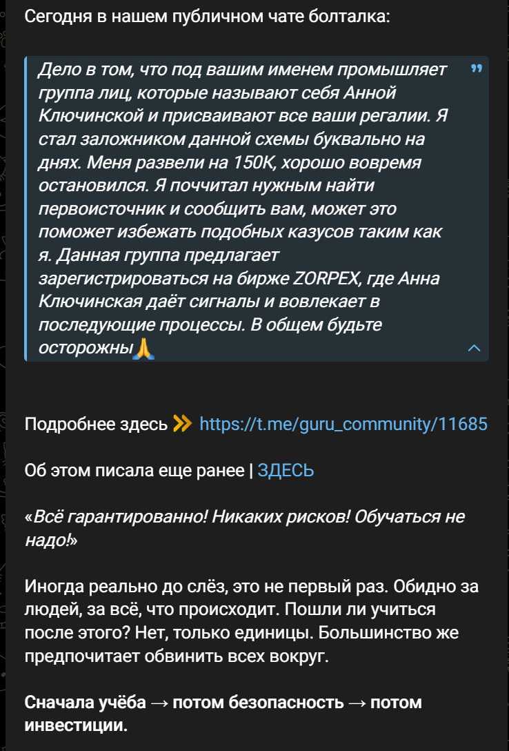 Анна Ключинская и проект Путь тех кто выбирает рост — фейк с заимствованным контентом, где подписчиков разводят на крупные суммы. Работать предлагают на криптовалютной бирже Zorpex, это еще одна однодневная платформа с кучей клонов.