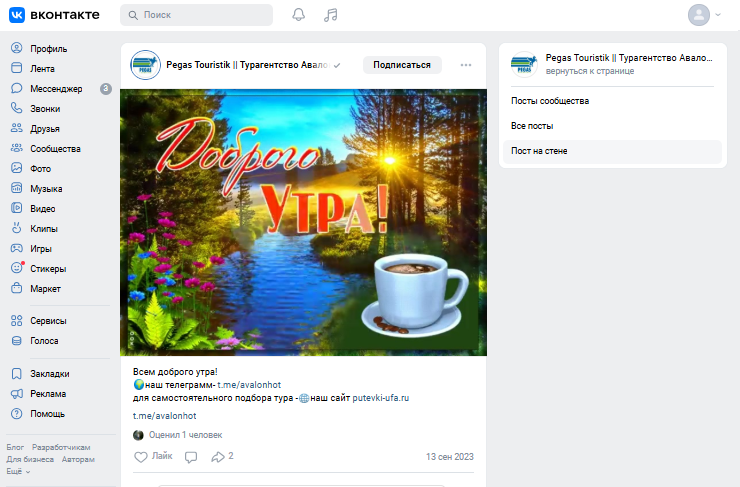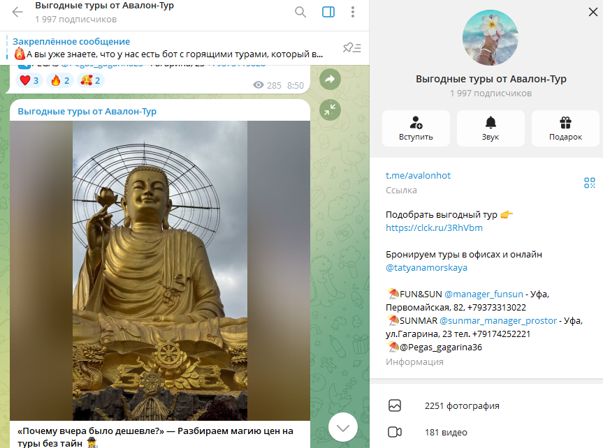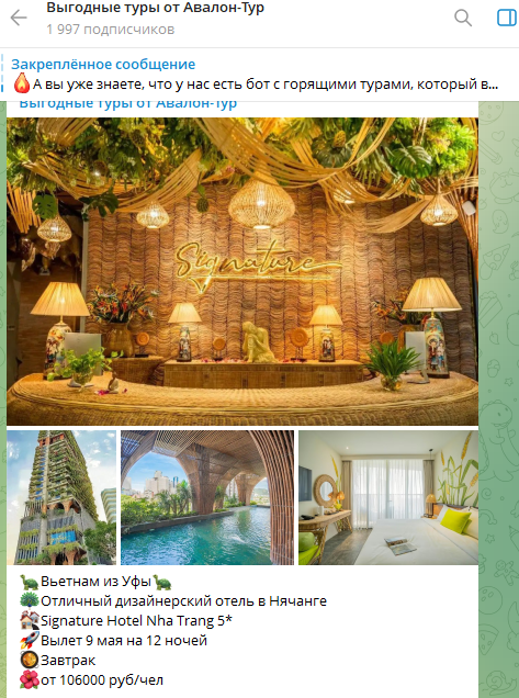 Главной платформой общения выступает тгк «Выгодные туры от Авалон‑Тур», зарегистрированный в мае 2021-го. В конце февраля 2026-го канал насчитывает примерно 2000 подписчиков. Публикации здесь выходят регулярно и набирают 300-800 просмотров. Это признаки наличия живой аудитории, но отклик в виде лайков остается сравнительно низким.