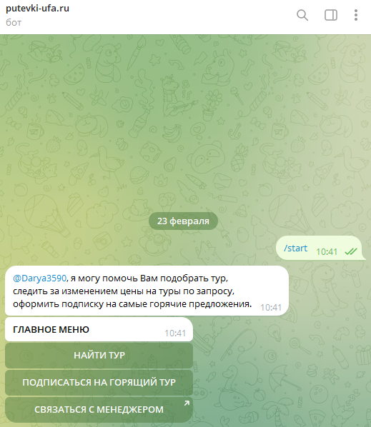 Дополнительным инструментом выступает PutevkiUfaBot. Компания позиционирует этого бота как поисковик эксклюзивных предложений со скидкой более 20%.