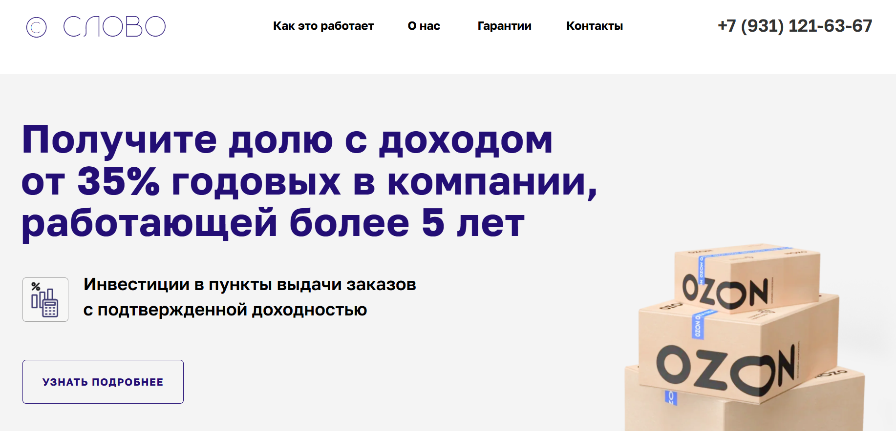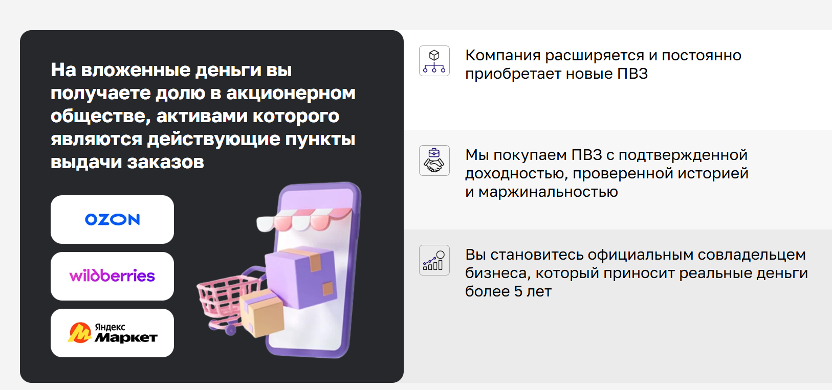 Компания «Пвз инвест» утверждает, что основным действующим активом у нее выступают пункты выдачи товаров. Тут нет привязки к одному маркетплейсу, так как поддерживается сотрудничество с разными магазинами. Самостоятельно открывать точки, обслуживать их и заниматься прочими нюансами работы бизнеса не требуется. От вкладчиков требуется только инвестировать в данный проект. Указывается, что минимальный порог входа составляет от 3 миллионов рублей. Соответственно, окупаемость вложений при указанной процентной ставке составит около 3 лет.