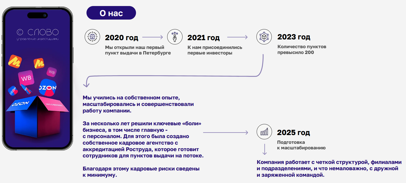 Инвестиционная платформа Pvz invest ru нуждается в инвестициях, так как бизнес развивается и расширяется, требуется открывать новые пункты. Руководство покупает только проверенные точки с доходностью. Инвесторы становятся совладельцами бизнеса. Несмотря на то, что указано уже более 5 лет работы компании в этой сфере, официальный сайт работает менее года, так как домен появился 4 сентября 2025 года.