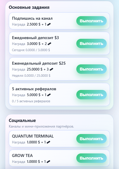 Хотя разработчики и говорят, что вложение – это не единственный выход, ведь есть еще задания, на деле все не так. Да, в данном разделе есть несколько квестов, которые можно выполнить: подписаться на канал, запустить другой бот и т.д. Однако все это быстро заканчивается.