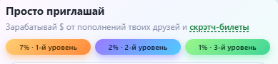 К слову, помимо бонуса за 5 рефералов, предусмотрены вознаграждения за каждого приглашенного пользователя: 7% – 1-й уровень, 2% – 2-й уровень, 1% – 3-й уровень.