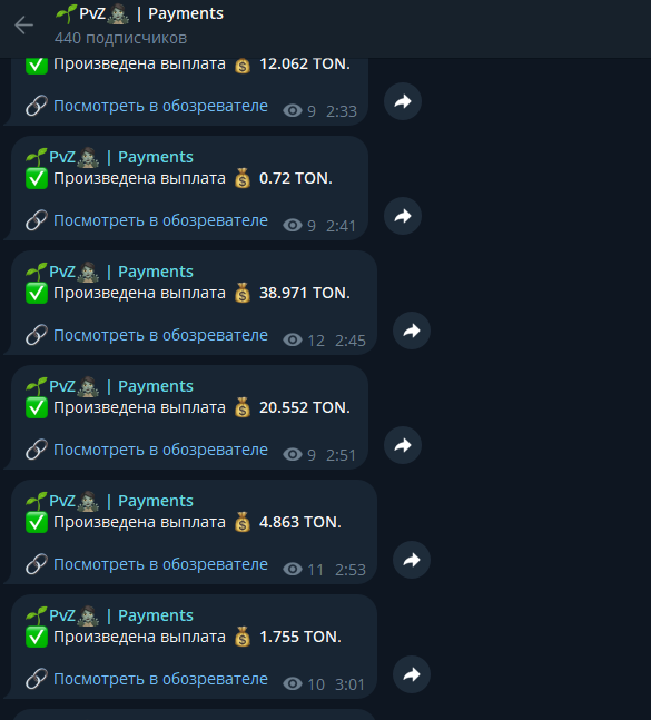 Что насчет выплат, то они якобы без проблем происходят на TON-кошелек в соответствующей вкладке. В качестве подтверждения в отдельной группе появляются уведомления о выплатах, но мы никак не проверим, являются ли они настоящими или нет.