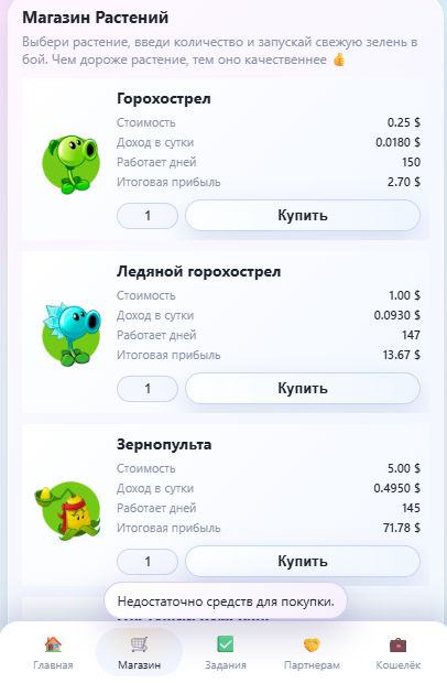 Сами растения необходимо приобретать в разделе “Магазин”. Как оказалось, они стоят реальных денег, работают определенное количество дней и приносят прибыль. Схема – типичная для популярных игровых пирамид. Возможно, кто-то даже сталкивался с чем-то похожим, особенно несколько лет назад.