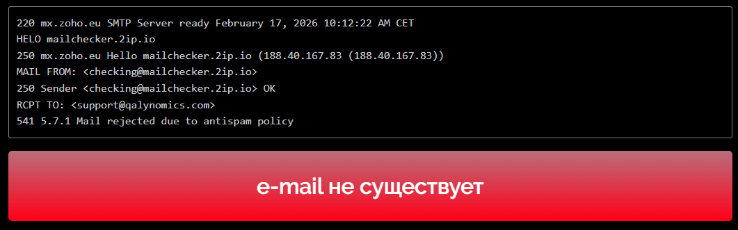 На сайте указан адрес офиса, причем это довольно известный центр в престижном районе Аргентины, но публичных реестров зарегистрированных компаний нигде нет, поэтому проверить реальное нахождение организации по этому местоположению невозможно. Email Support@QalyNomics com тоже оказался недействительным, как показывает информация с аналитического сервиса 2Ip.