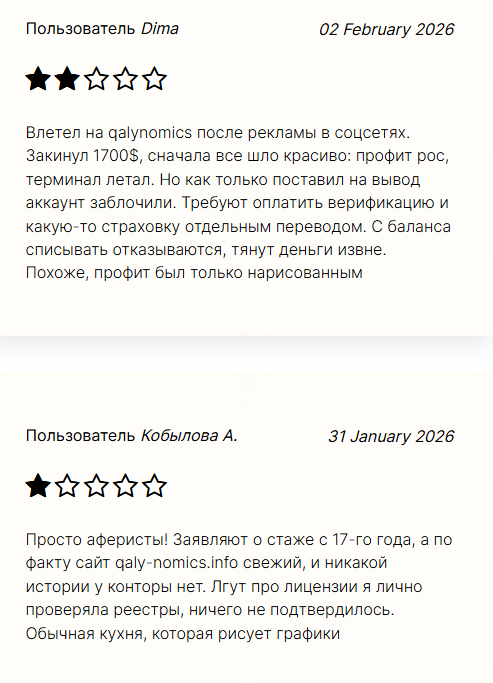 В отзывах о QalyNomics некоторые также пишут, что видели прибыль на балансе, только вывести ее не смогли, а также многие подчеркивают отсутствие лицензий и истории проекта, что еще раз доказывает малый срок работы сайта. Так как положительные отклики полностью отсутствуют, можно сделать вывод, что репутация у проекта «КалиНомикс» в сети крайне отрицательная.