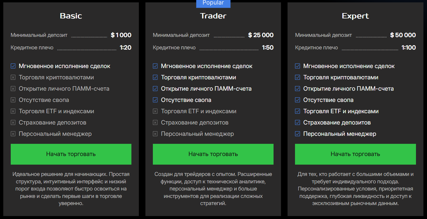 О комиссиях на QalyNomics com ничего не сказано, как и о плате за обслуживание, но представлено три валютных тарифа, которые отличаются размером кредитного плеча, отсутствием свопов и персональным менеджером: