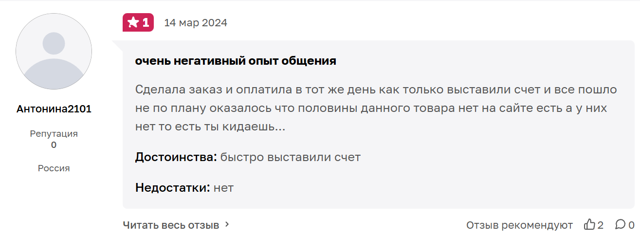 Встречаются и жалобы, в которых клиенты отмечают проблемы с доставкой товара и наличием запрашиваемой продукции.