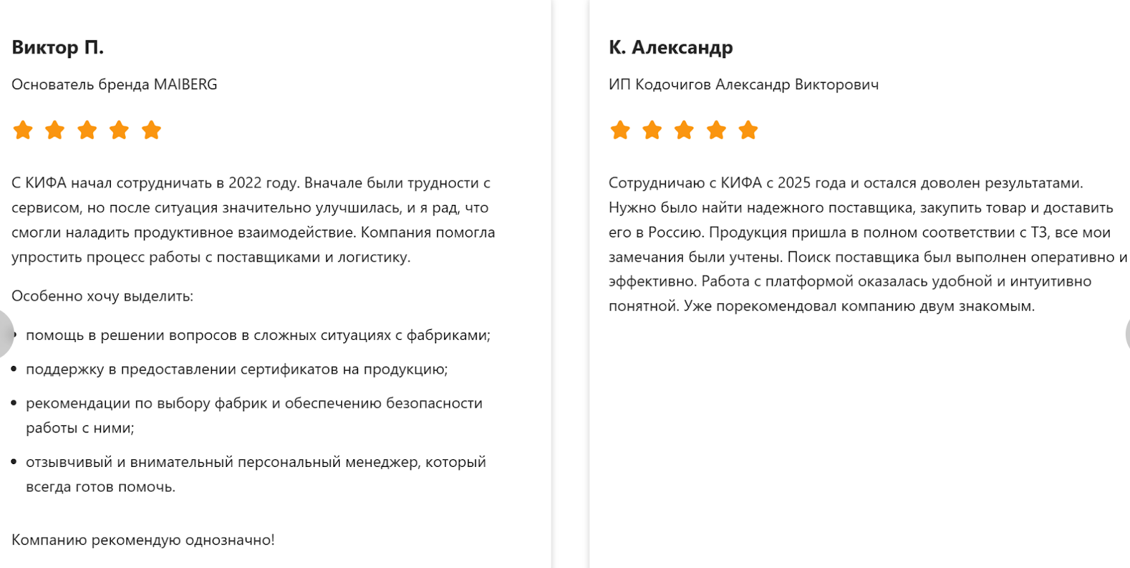 На официальном сайте платформы представлены только позитивные отзывы о ПАО Кифа и сотрудничестве с компанией. В них пользователи рассказывают о высоком качестве сервиса, упрощении логистики и учете пожеланий клиентов.