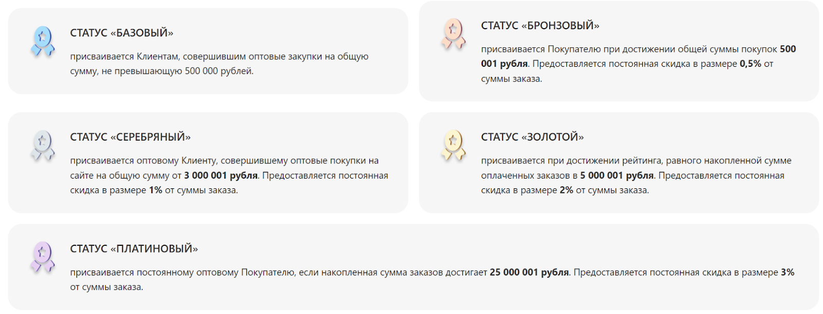 Компания предлагает улучшенную бонусную программу и возможность оплаты с помощью накопленных баллов. После отгрузки пользователям необходимо подтвердить сделку. После этого на счет зачисляется 1% с каждого заказа. Впоследствии можно заплатить накопленными бонусами за товар, но не более 10% от стоимости. Также размер скидок зависит от статуса.