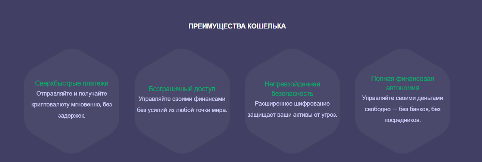 На сайте перечислены главные преимущества кошелька, в том числе – сверхбыстрые переводы крипты без задержек. При этом не перечислены ни поддерживаемые криптовалюты, ни комиссии системы, ни лимиты или другие принципиально важные детали.