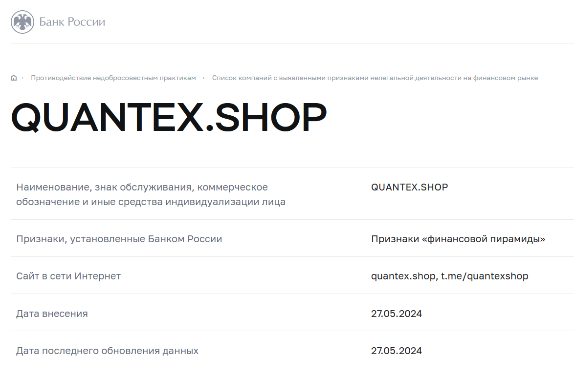 Отдельно стоит отметить, что в реестре финансовых пирамид Центрального банка России есть запись о неком обменнике Quantex Shop. Но здесь указана другая ссылка, совпадает только название. И не факт, что он как-то связан с рассматриваемым кейсом.