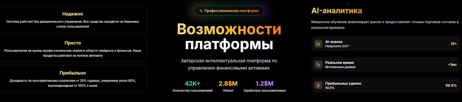 Ниже пишут уже о других показателях: 42 тысячи пользователей и 99.9% успешности сделок. Во-первых, несостыковка. Во-вторых, еще более нереалистичные данные.