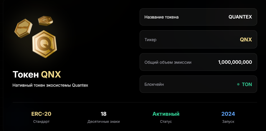 Еще обменник Quantex сообщает о собственном токене QNX на базе TON с миллиардной эмиссией. Однако доступен он только непосредственно внутри этой экосистемы. В реальный рынок не выпускался и не имеет ценности на нем. И хоть сообщается о стандарте ERC-20, вывести его из рассматриваемой платформы не получится.