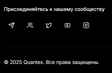 Еще на сайте инвестиций Quantex есть иконки социальных сетей Telegram, Discord, X (Twitter), YouTube и Instagram. Но они не работают, ссылки ведут все на ту же главную страницу.