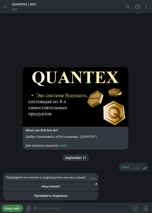 Еще один ресурс в Telegram — бот Quantex с юзернеймом Quantexrobot. Разработчики сообщают, что здесь доступна большая часть функций, что и на веб-ресурсе. Для запуска необходимо подписаться на канал проекта.