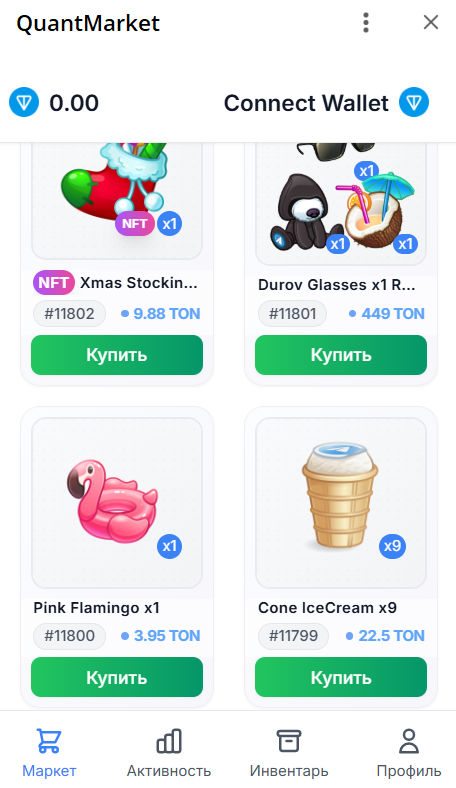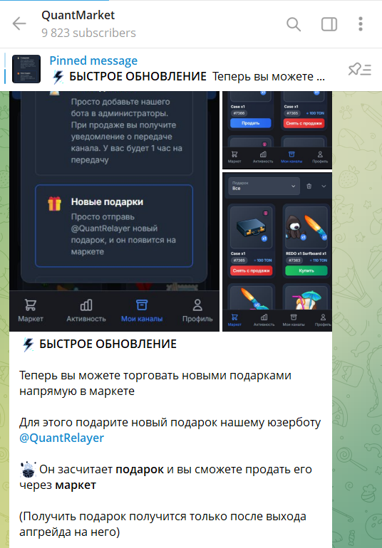 Проект предлагает покупку NFT-подарков в Telegram за TON, используя специального бота с ником QuantMarketRobot. Разработчики «Квант Маркет» в своем канале в Телеграме пишут, что это первый автоматизированный маркетплейс для трейдинга подарками. На сентябрь 2025 года площадка продолжает активно поддерживаться, например, 01.09.2025 вышло обновление, которое позволило торговать новыми подарками напрямую в маркете.