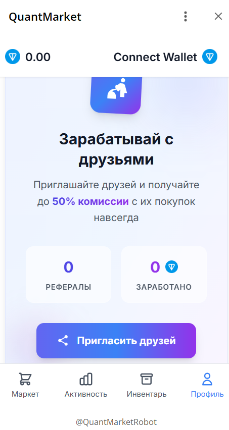 Реферальная программа предлагает до 50% комиссии с покупок приглашенных клиентов навсегда, однако как именно будут начисляться средства неизвестно, ведь у бота с ником QuantMarketRobot нет собственного кошелька, а авторы проекта не дают по этому вопросу никаких отзывов. Согласно интерфейсу мини-приложения, выплаты производятся в TON, а также клиенту отображается общее количество дохода с привлеченных пользователей.