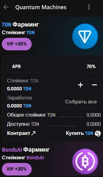 Чтобы увеличить прибыль, пользователь может приобрести VIP за 2 TON в месяц, с которым появляются новые возможности для участия в раздаче внутренних токенов.